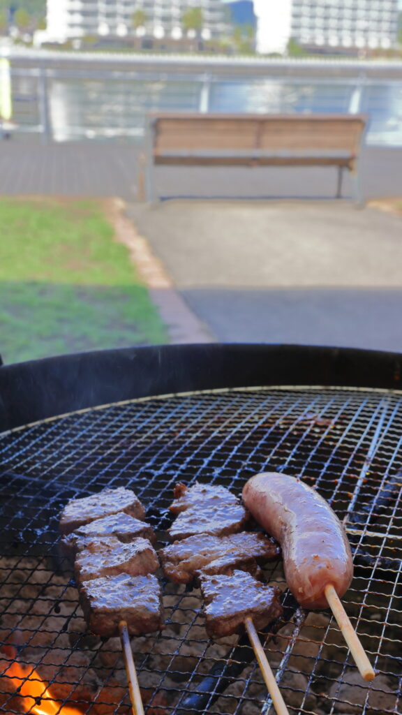 さて、この飛騨牛の和牛串、あまり強火でガンガンと焼きすぎないようにしてくださいね。表面にサッと焦げ目がつき、中の赤身部分がほどよくなくなったミディアムレアが食べ頃です。まずは塩コショウでぜひ!脂の甘味と赤身の旨味、甘い香りにほんのりと炭の香りもプラスされ、なんとも至福の味わいです!