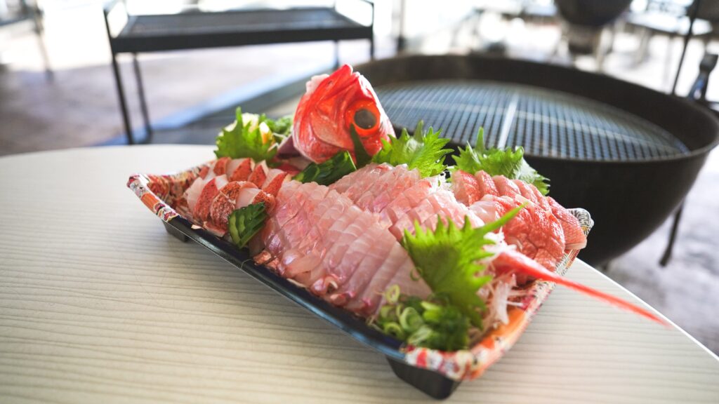 鮮魚市場の対面鮮魚コーナーで買った新鮮なお魚。実はお魚代+550円(税込)で、プロの職人が豪華な「姿造り(お刺身)」にして、なんとBBQ会場のお席まで直接お運びするサービスがあるんです!BBQの網で海鮮を焼きながら、獲れたての豪華な姿造りをつまむ……最高の贅沢をぜひ味わってみてください。