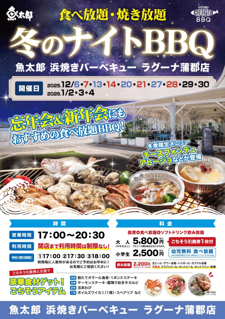 魚太郎 浜焼きBBQ ラグーナ蒲郡店はですね、この冬も連日営業致しております。