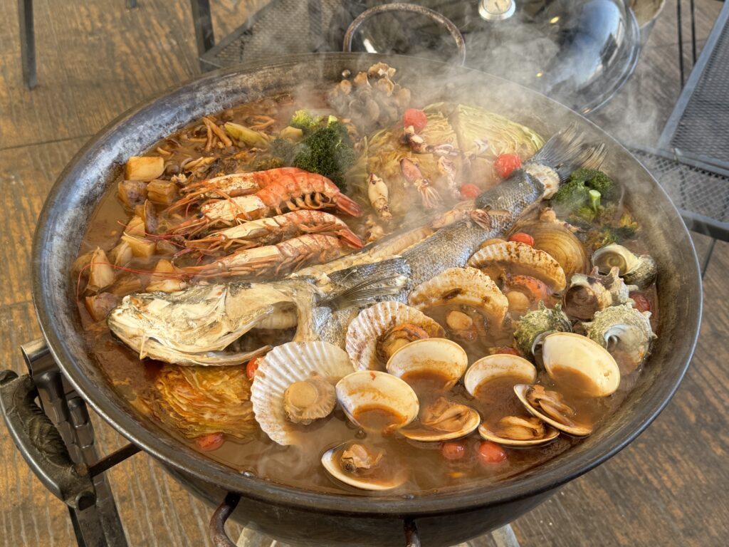 【 蒲郡BBQ史上最大のサイズ!この冬限定!その名も『これぞ!漁師風、豪快ブイヤベース!』 】でございます。映えもきっちり抑えた、大鍋に魚が丸ごと入った魚屋にしか出来ない、冬限定のプランです!