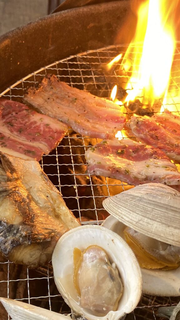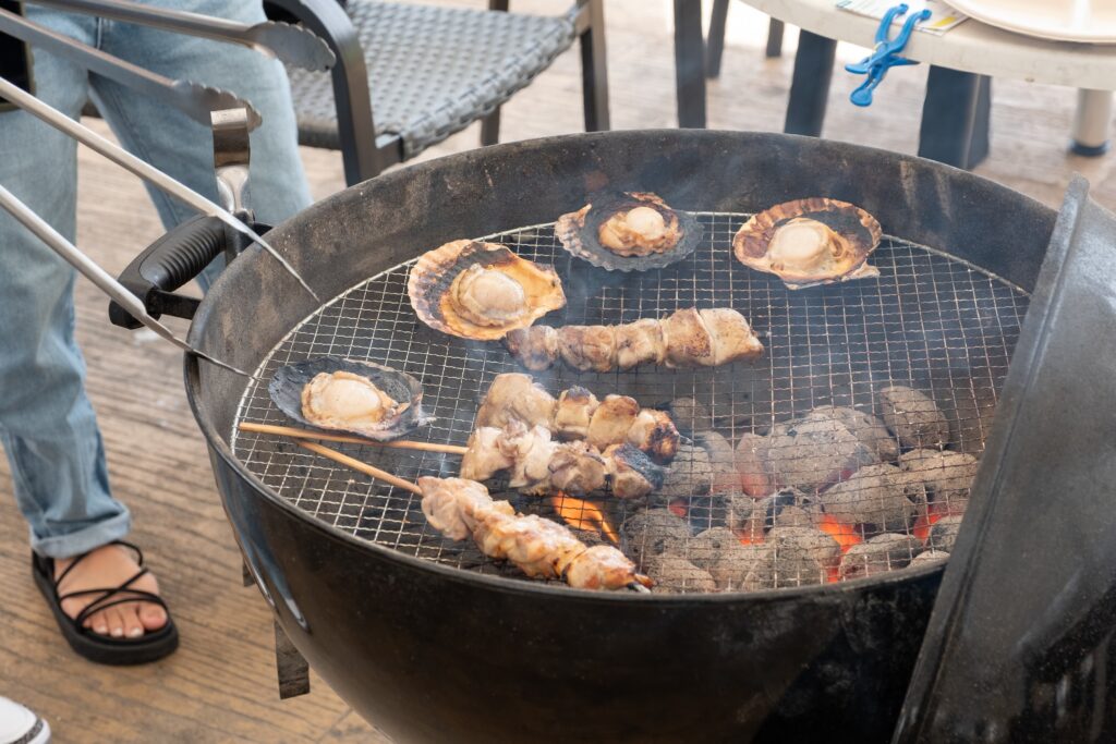 最初に提供する炭でまともにBBQが楽しめる時間は約40分なので、デザートの時間まで考えると途中で炭を足す必要があります。その際もスタッフにお声がけを。また、炭火が消えそうな時や、反対に炎が出すぎてしまった時など、困った時はいつでも呼んでください。魚太郎の炭奉行が飛んでいきます!