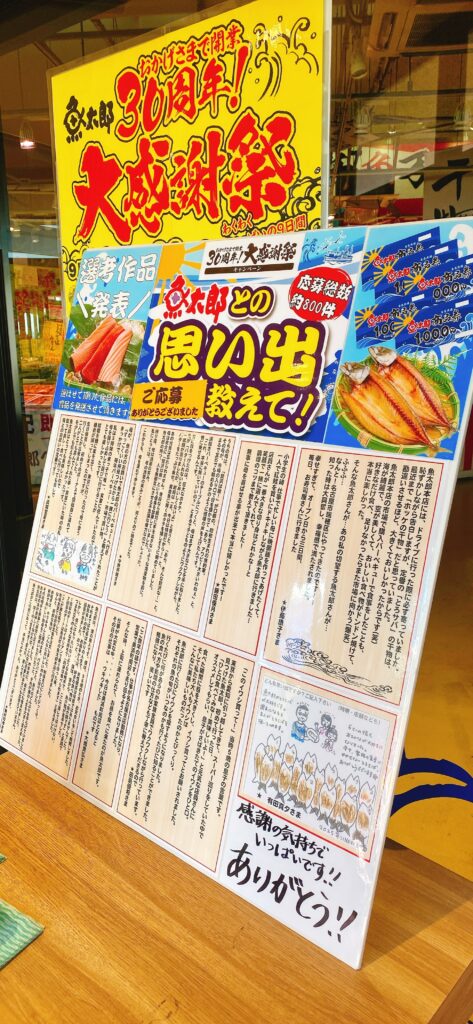 わたくしども『魚太郎株式会社』は9月に、めでたく30周年を迎えることが出来まして、これも偏にお客様の多大なるご支持・ご声援あってのことにございます。30周年感謝祭に際しましても、魚太郎各店舗で記念イベントも行われまして、連日多くのお客様に足を運んで頂きました。全店で行った、福引の当たった方々、おめでとうございます。