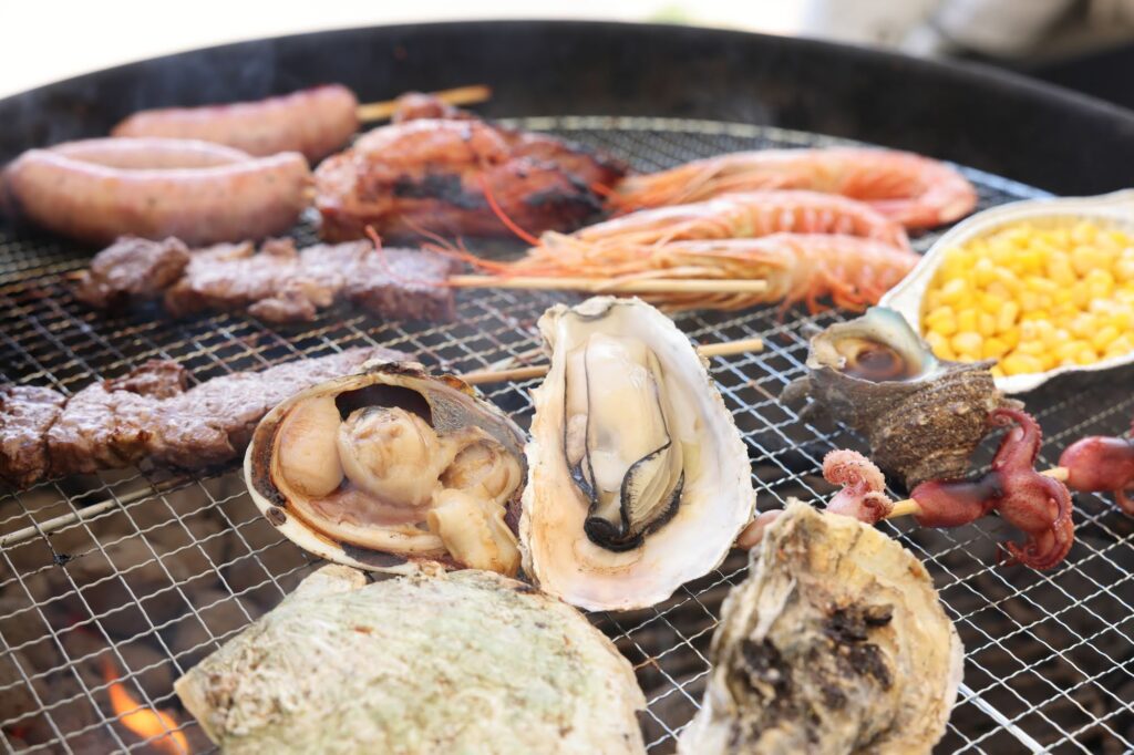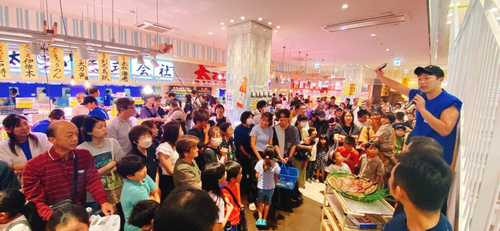 魚太郎ラグーナ蒲郡店は鮮魚市場と 浜焼きバーベキューがお隣同士。