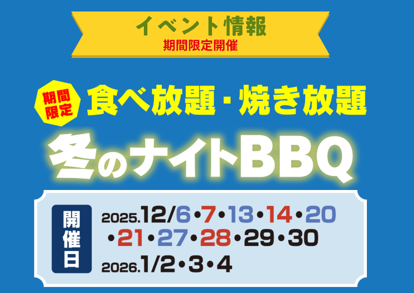 今月ご来店いただいた際にスタンプカードを大人人数分お渡しをいたします。蒲郡・本店BBQどちらでも構いません。そしたら、ぜひとも来月もご来店ください。つまりは11月・12月と2ヶ月続けてご来店いただいて、そのスタンプカードにスタンプをもらってください。そうすると、そのスタンプカードで年明け2026年1/10 ~ 3/8までの期間中、入場料がなんと無料になっちゃうんです!しかも期間中何回ご来店でも無料!さらに同伴の方4名様まで有効!さらにさらに、蒲郡・本店BBQ共用なので、どちらのお店でも使えちゃう!という、なんともスペシャルなイベントでございます。