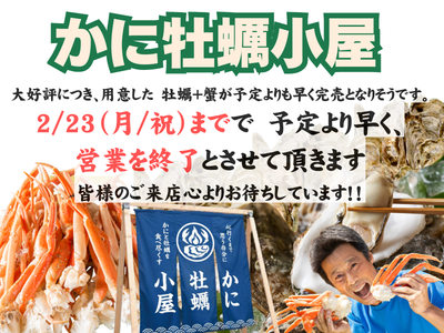 2026/2/12更新 大好評につき、用意した 牡蠣+蟹が予定よりも早く完売となりそうです。 2/23(月/祝)までで 予定より早く、営業を終了とさせて頂きます 2/14(土)15(日)2/21(土)2/22(日)2/2 … 冬季限定イベントに注目!魚太郎本店に『かに牡蠣小屋』が誕生!蟹も牡蠣も食べ尽くせ!!食べ放題プランが絶対お得!!