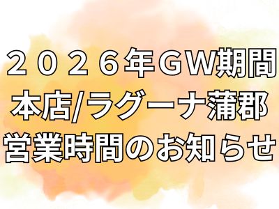 2026年 GW期間 本店/ラグーナ蒲郡 営業時間のお知らせ 2026年4月5日本店ラグーナ蒲郡店以下の期間は営業時間を変更致します。※商品によっては売り切れる場合がございます。ご容赦ください。詳細はこちらから