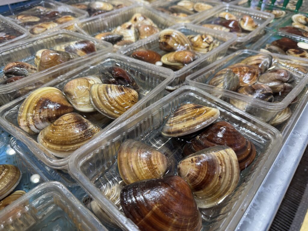 地物・大粒の**「活はまぐり」**もご用意しています。プリプリの身と