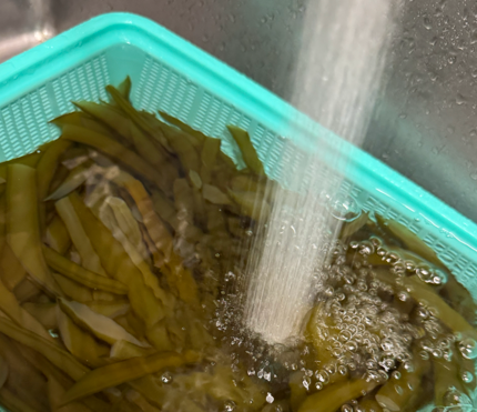 わかめの茎の部分もきんぴらにすると美味しいです。刻んで水にさらにして塩を抜いて炒めるだけ