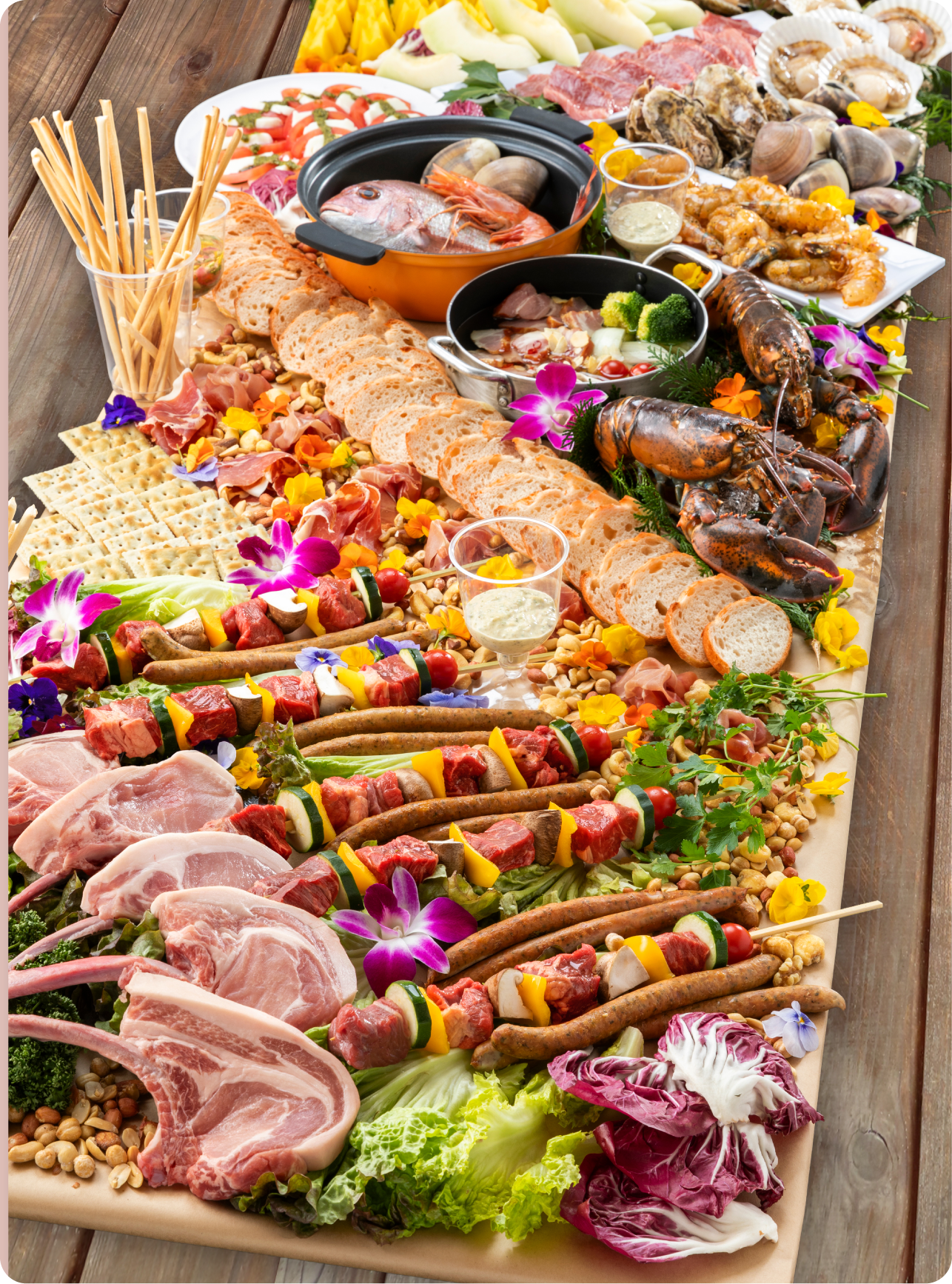 - ※手前のウッドボードの上の選べる2,200円分の食材1名さまの一例です。