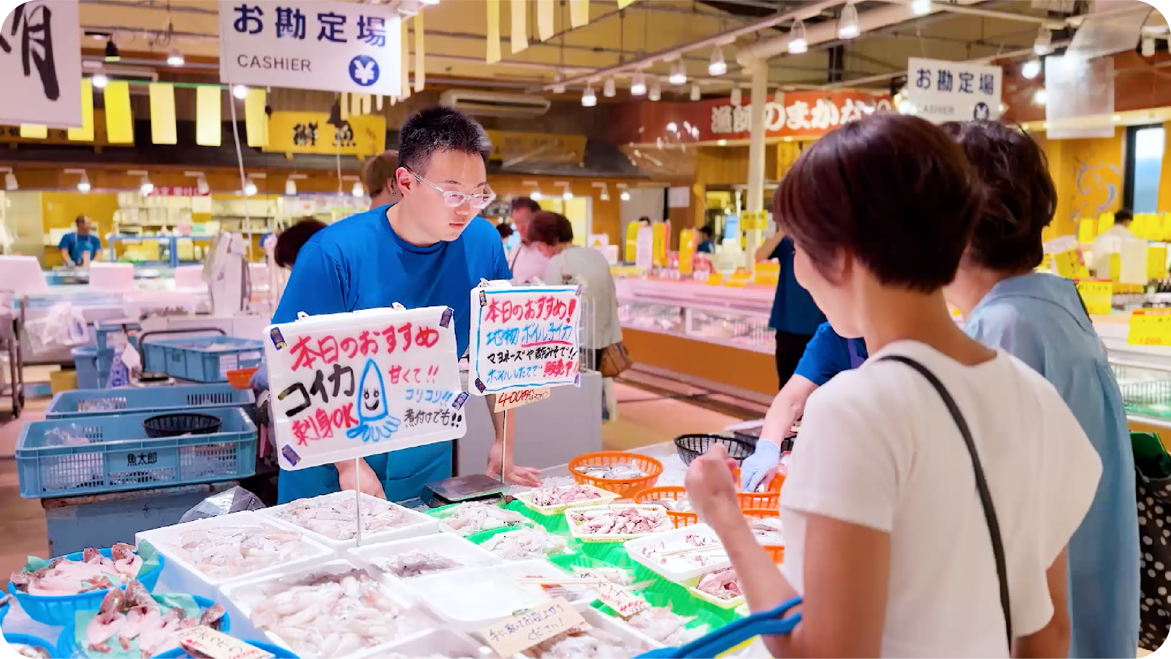 - 魚の食べ方を説明し、買っていただいたお客様が再び来店されて、「あの調理法で食べたらおいしかった、また買いに来たよ」といわれたこと。本当に嬉しかったです。魚の陳列も売れるように工夫することが楽しく、実際に売れるとそれが喜びにつながります。