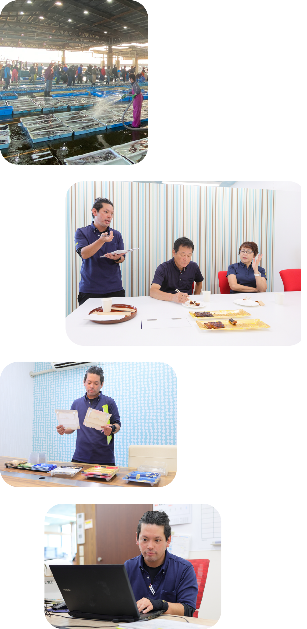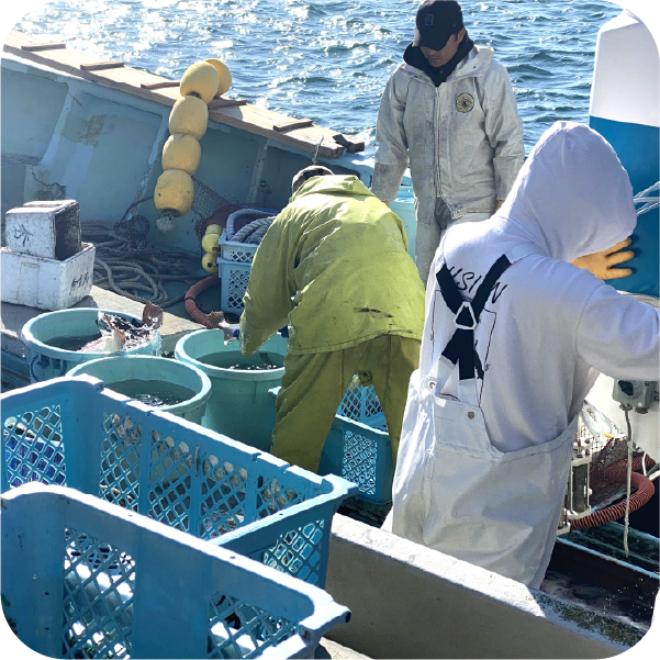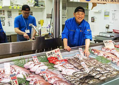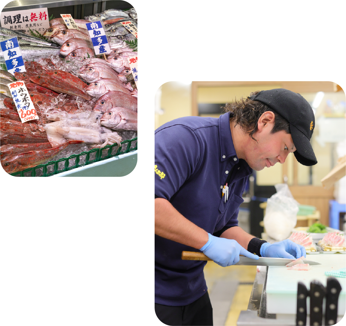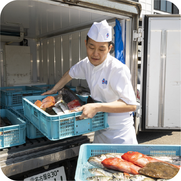セリは毎日早朝からスタート。全国の相場と南知多の相場の双方を頭に入れながら、「これは店舗で販売したら売れそうだ」と考えながら買いつけを行います。漁師や仲買人といかにコミュニケーションを取りながら新鮮な魚をより安く競り落とすかが勝負。その腕は、先輩に教えてもらいながら磨きます。また全国的にも珍しい夕市も行われるので、ここでもセリに参加し、競り落とした魚を新鮮なまま店舗に運ぶのも仕入れ担当の大切な仕事です。